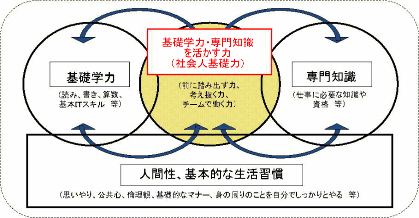 今、社会で求められているのは、「基礎学力」「専門知識」に加え、それらをうまく活用し、「多様な人々とともに仕事を行っていく上で必要な基礎的な能力(=社会人基礎力)」です。